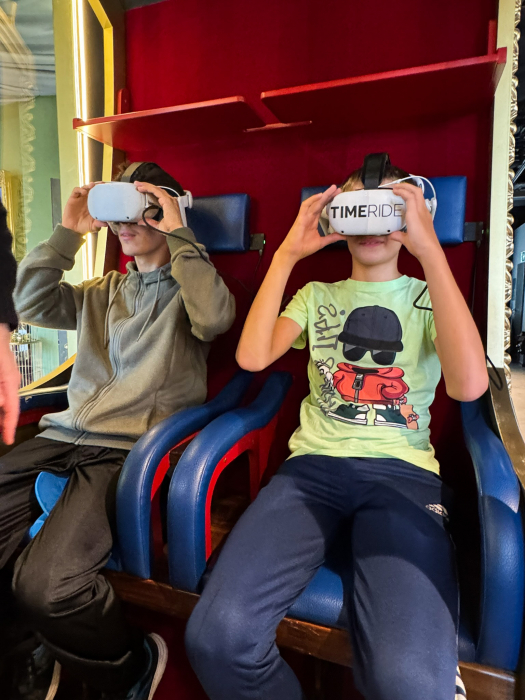 Danach ging’s zu TimeRide. Plötzlich waren wir nicht mehr in Dresden 2024, sondern mitten in einer Hochzeit im Jahr 1719! Mit VR-Brillen auf der Nase, sitzend in einer Kutsche und verrückten Kulissen fühlten wir uns wie Zeitreisende. Wer hätte gedacht, dass Geschichte so cool sein kann?
