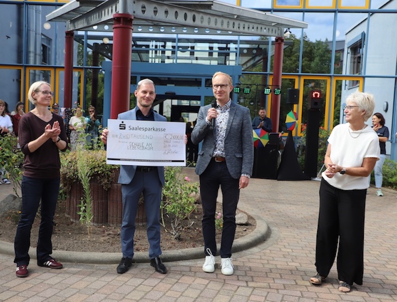 Ein Mitarbeiter und ein Auszubildender der Saalesparkasse Halle überreichten unserem Förderverein einen Spendenscheck in Höhe von 2000 €.