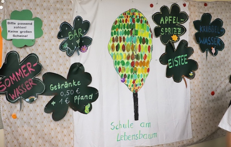 Ein bunt geschmückter Schulhof, im Foyer ein leckeres Kuchenbüffet mit einer erfrischenden Getränkebar, im Innenhof roch es nach Popcorn und die Hotdogwürstchen warteten schon auf hungrige Gäste: also alles vorbereitet für Schüler, Mitarbeiter und Gäste zum diesjährigen Sommerfest in der Schule am Lebensbaum.