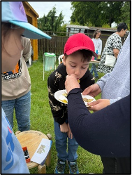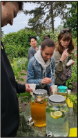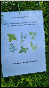An der Kräuterstation suchten die Schüler zunächst die Kräuter anhand von Bildern im Kräuterbeet heraus. Danach probierten sie erfrischende Kräuterlimonade und durften selbst Kräuter auf eine Quarkschnitte streuen und verkosten. Sie untersuchten und verglichen die Kräuter anhand ihres Aussehens, ihres Dufts und ihres Geschmacks.