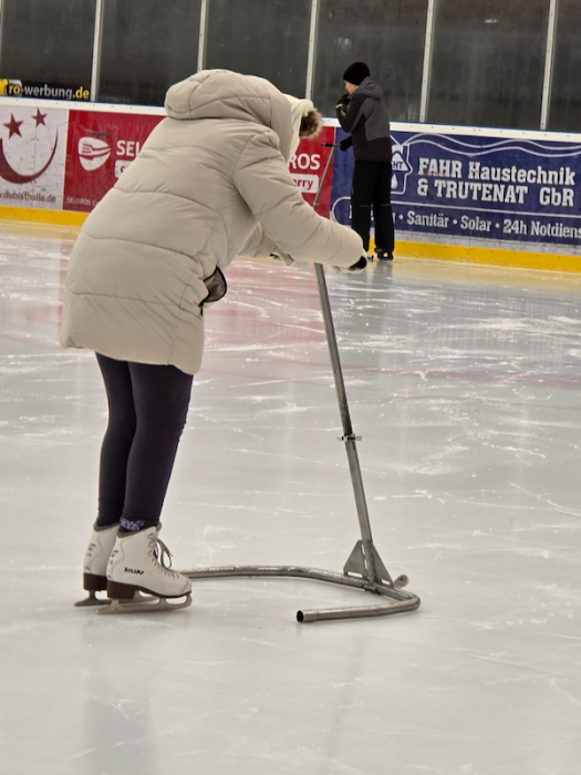 Wir wurden von drei Trainern sehr freundlich empfangen und bekamen alle unsere Schlittschuhe. Allesamt bekamen wir eine Einweisung und übten schonmal auf dem Trockenem, wie man auf den Schlittschuhen steht und wieder aufsteht, wenn man mal hinfällt. Im Prinzip so, wie man die ersten Schritte machen würde.