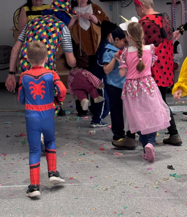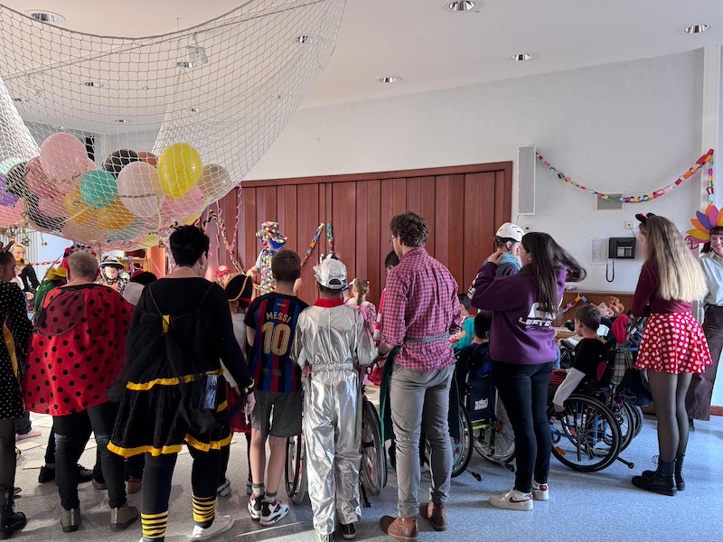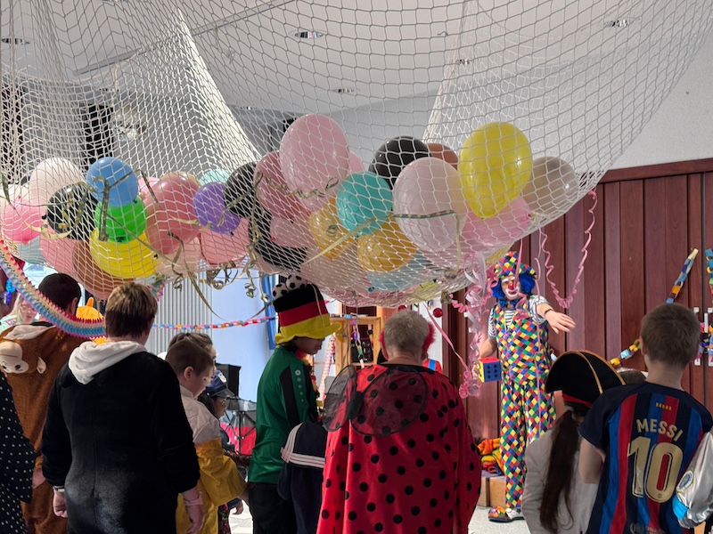 Buntes Treiben im Schulhaus- es ist Faschingszeit und die Grundstufe feierte ausgelassen in der Aula.