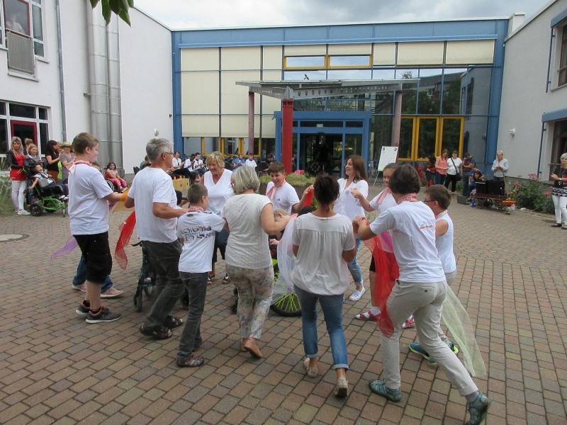 Die Schüler der Grundstufe stimmten alle Anwesenden mit einem kleinen Programm auf den gemeinsamen Nachmittag ein. Die Schüler tanzten und musizierten einige Stücke, die unseren Erstklässlern und deren Eltern bestimmt noch in guter Erinnerung von der Einschulungsfeier waren. Mit viel Applaus zeigten nun alle Anwesenden vom Sommerfest, dass auch Ihnen diese Beiträge gefallen haben. Unsere 2. Klasse hat im Anschluss unter Anleitung ihrers Pädagogen- und Mitarbeiterteams ein tolles Trommellied aufgeführt und viel Beifall dafür erhalten.