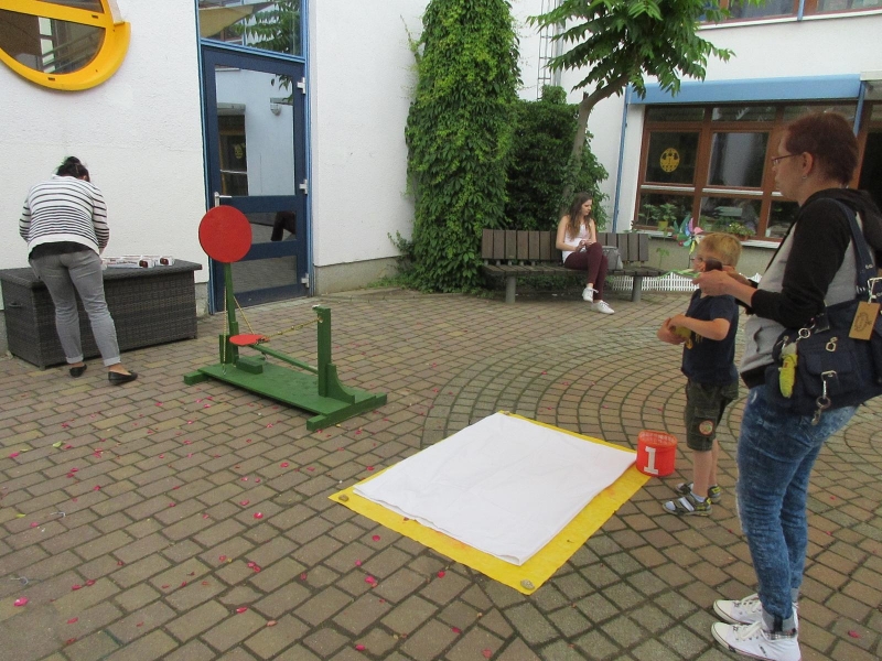 Der ganze Schulhof war bunt ausgestaltet und hielt eine Vielzahl spannender Aktionen für Klein und Groß bereit. Kollegen und weitere Mitarbeiter der Schule hatten witzige und erlebnisreiche Spielstationen vorbereitet- Spaß war garantiert und der Andrang groß!