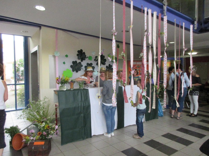 Gespannt warteten im Hintergrund die Mittelstufenschüler auf ihren großen Auftritt, denn mit einer kleinen Tanz– und Theateraufführung stimmten sie uns alle auf das fröhliche Treiben ein. Passend zur Reise durch die Jahreszeiten, zeigt sich der Himmel erst sonnig und dann doch regnerisch. Doch auch der kurze Regenschauer konnte die ausgelassene Stimmung nicht trüben. So wurden nach dem Auftritt kurzer Hand und ganz spontan die Außenaktionen in das Schulhaus verlegt. Geschicklichkeitsübungen, Dosenwerfen, Kirschkernweitspucken, Kinderschminken, Bastelangebote und vieles mehr machten den Kindern auch im Schulhaus Spaß. Einzig die Elternvertreter am Grill haben sich tapfer dem Regen gestellt. Doch ausgerüstet mit Regenjacken und Schirm haben es alle Würstchen trocken in die hungrigen Münder geschafft. Wer nicht schon vom reichhaltigen Kuchenstand oder den Grillereien satt wurde, für den war auf jeden Fall an der einladenden Salatbar etwas dabei. Ob nun verschiedene Nudelsalate, Obstsalate, Tomatensalate oder Spargel-Erdbeeren-Salat, hier blieben keine Wünsche offen. An der Bar konnte jeder Gast aus verschiedenen wohlklingenden Getränken auswählen, die ihrem Namen alle Ehre machten. Es war für alle ein gelungenes Sommerfest.