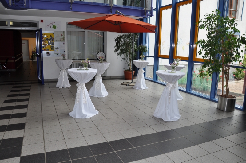Liebevoll geschmückt und einladend ausgerichtet empfing das Foyer all seine Gäste zur Sommerbar und lud ebenso zu Kaffee und Kuchen ein. Doch ehe alle Gäste ins Foyer eintreten konnten, hieß Herr Karge alle Schüler, Kollegen, Eltern, ehemalige Kollegen und zahlreiche Gäste herzlich Willkommen.